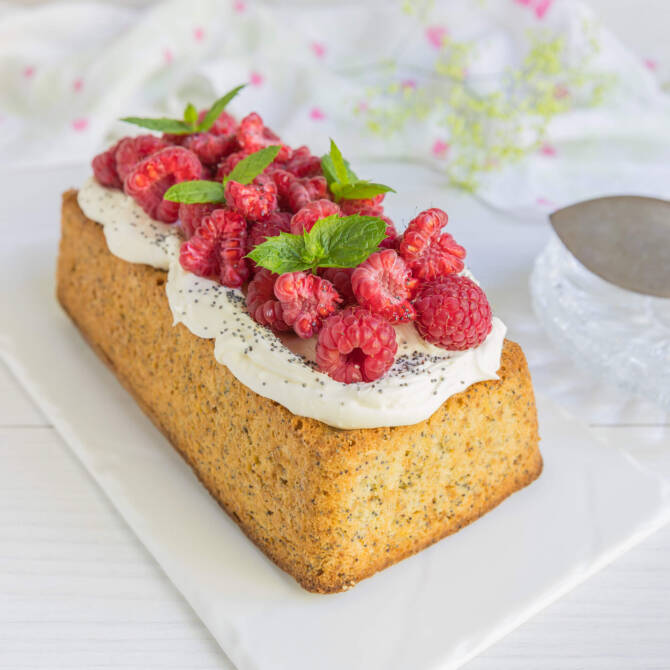 Pound cake with poppy seeds and raspberries